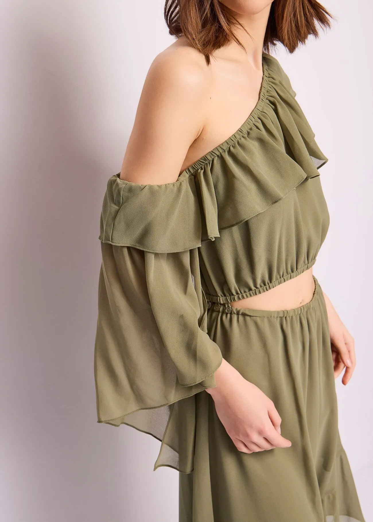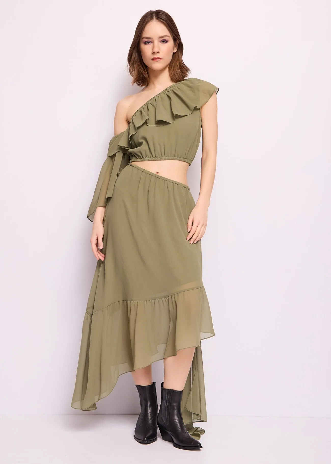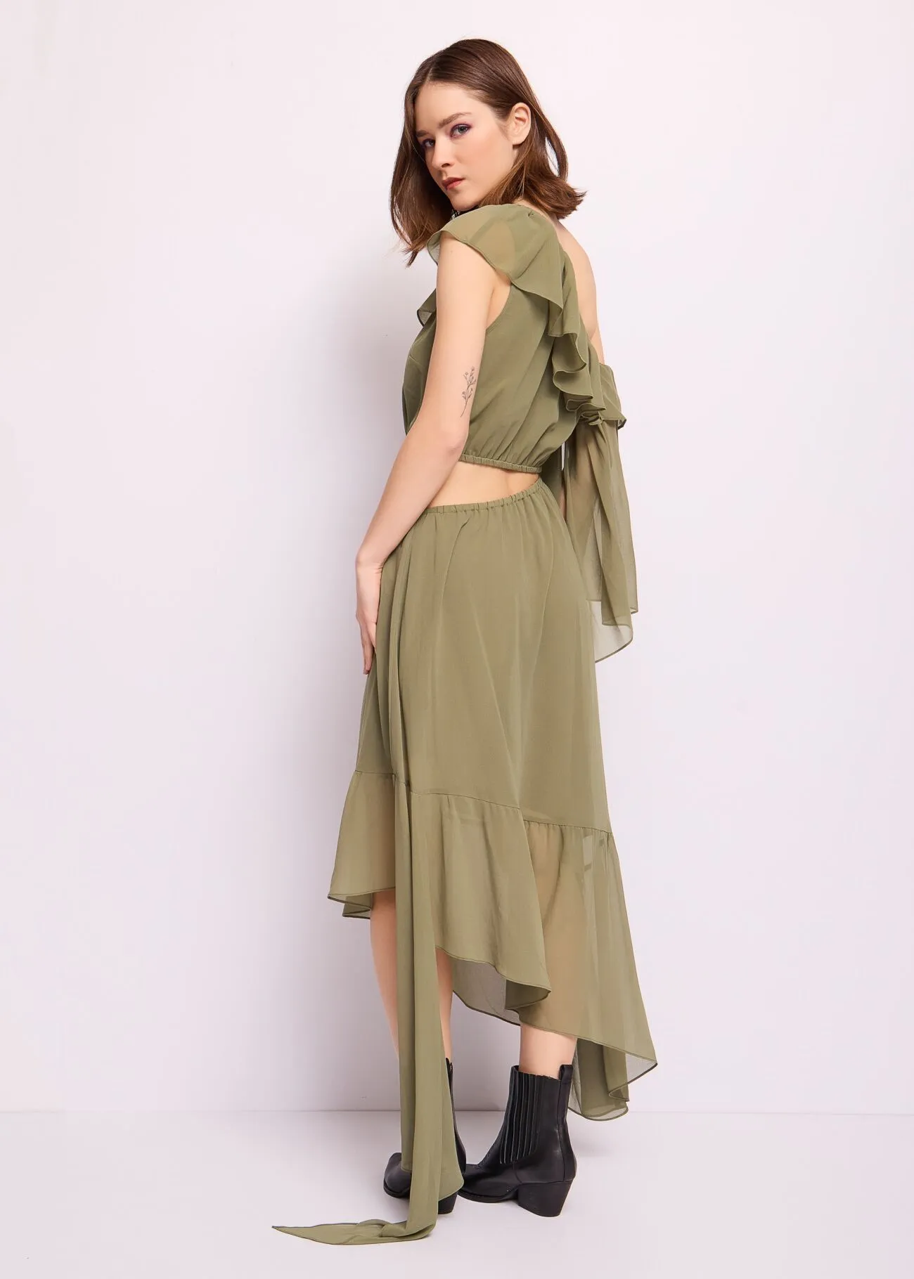 Vestido midi en georgette Asimétrico con volantes Motivo troquelado Bajo asimétrico Volante en el bajo Forro interior